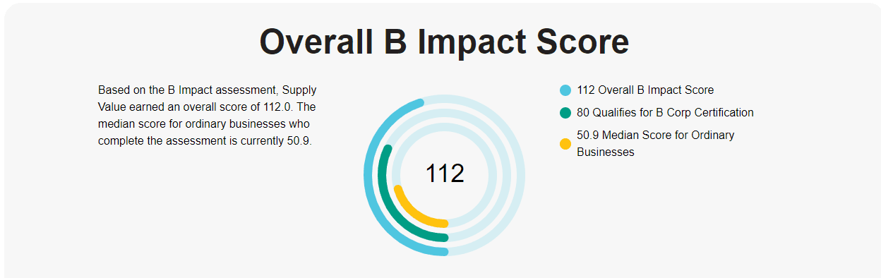 Sinds onze oprichting in 2007 staat duurzaam en sociaal ondernemen centraal in de manier waarop Supply Value zaken doet. Om onze werkelijke status te beoordelen en verbeterpunten te identificeren, hebben we de afgelopen maanden het B Corp-assessment ondergaan, met als resultaat een score van 112 punten (een gemiddeld bedrijf scoort doorgaans 51 punten). Hiermee hebben we ruimschoots onze B Corp certificering en zijn beoordeeld als "uitstekend" volgens de B Corp-normen.